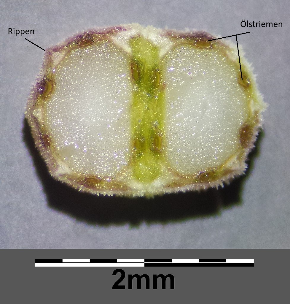 Frucht im Querschnitt mit 2 Ölstriemen zwischen je 2 Rippen