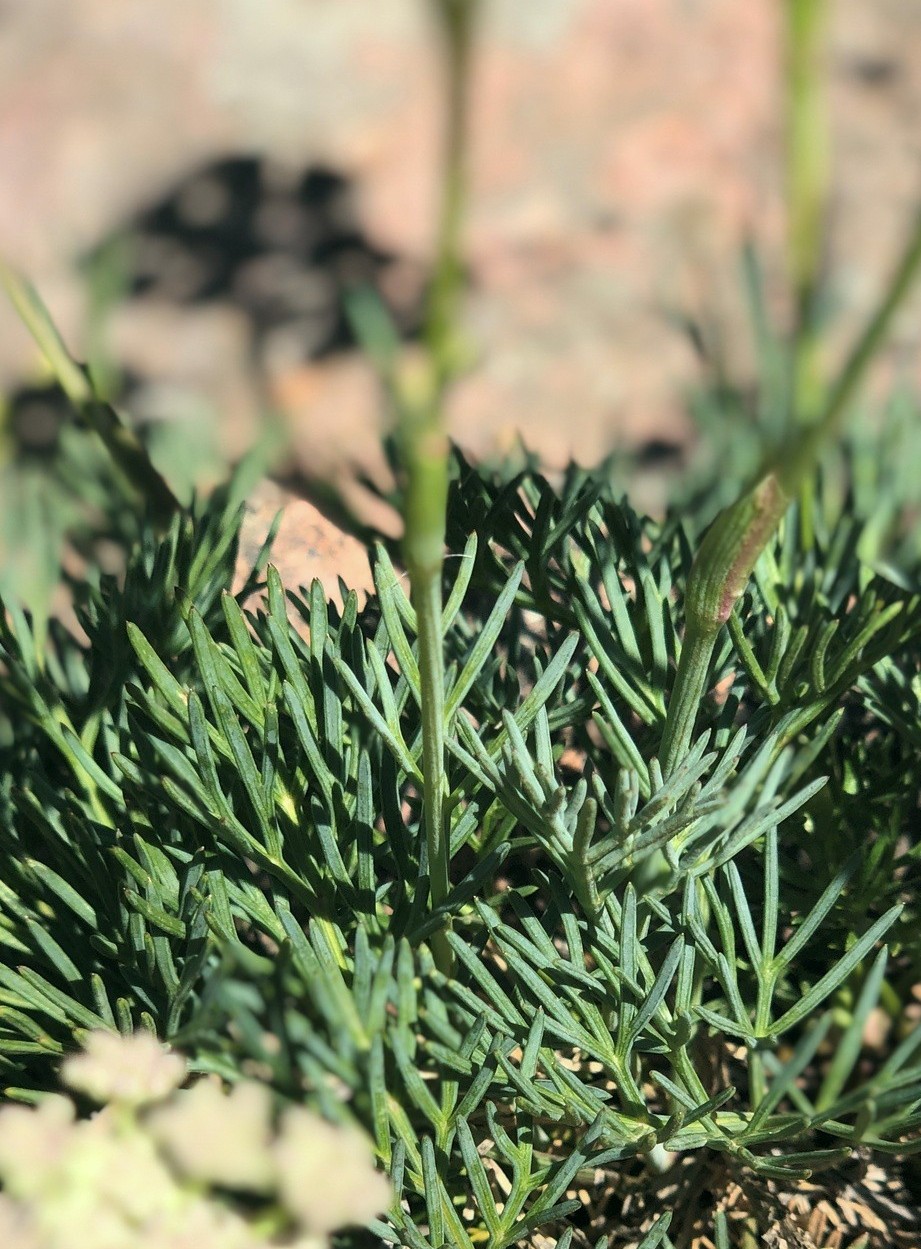 verwachsen, Blätter blaugrün, 2 - 3- fach gefiedert, Fiederabschnitte fädlich,