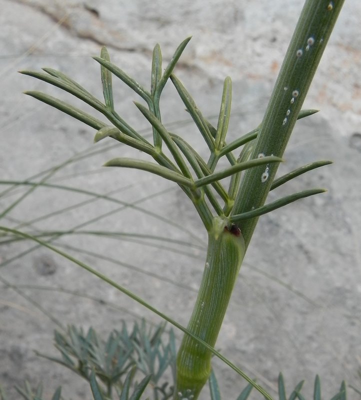 Grundblätter 2 - fach gefiedert, blaugrün, ledrig, mit linealischen, 2 - 5 mm breiten, vorne meist dreiteiligen Fiederabschnitten, Blätter mit einer wachsartigen Schicht überzogen, die ihnen eine ausgeprägte blaugrüne Farbe verleiht, reibt man die Wachsschicht ab sind die Blätter grün
