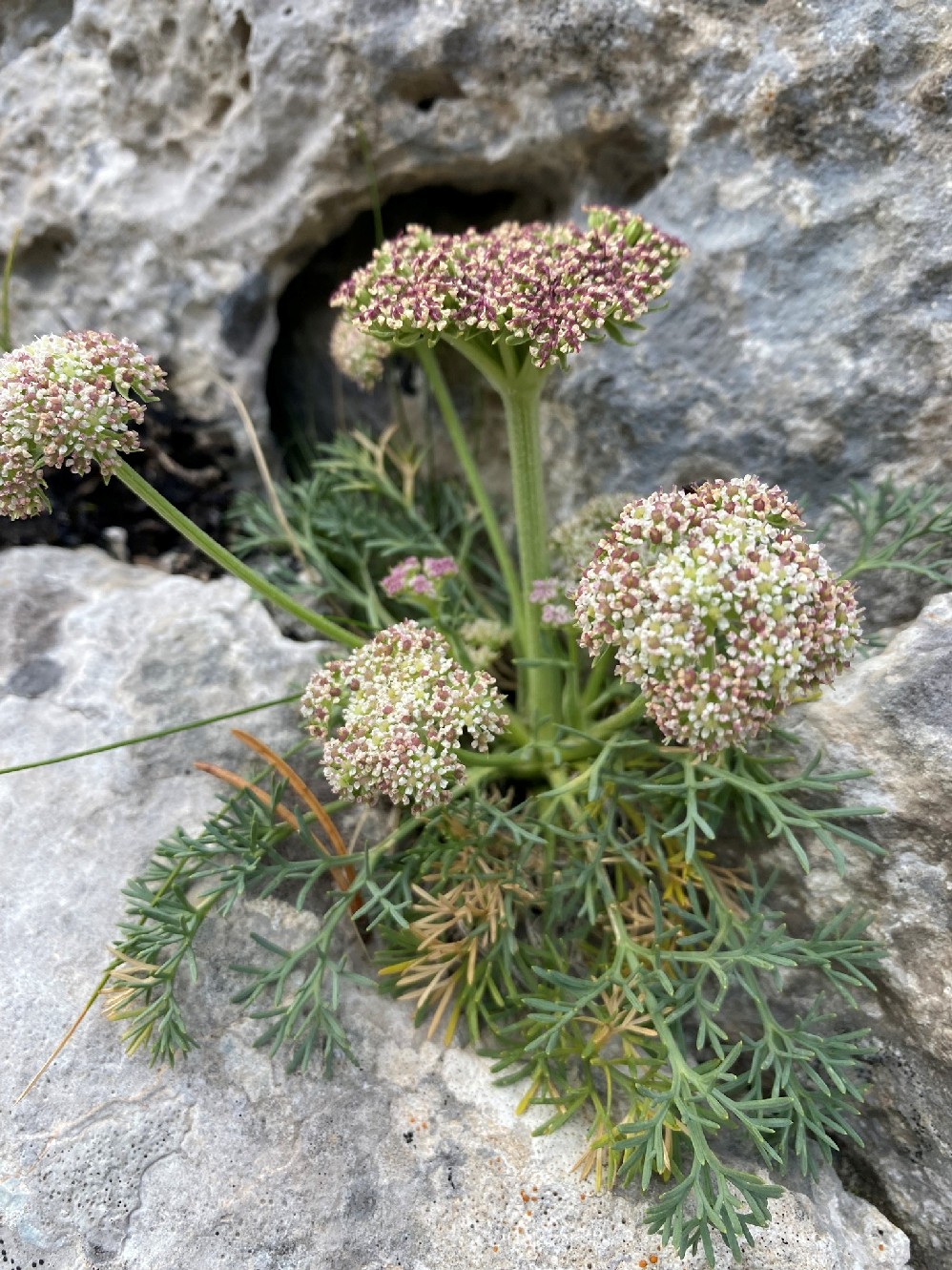 verwachsen, Blätter blaugrün, 2 - 3- fach gefiedert, Fiederabschnitte fädlich