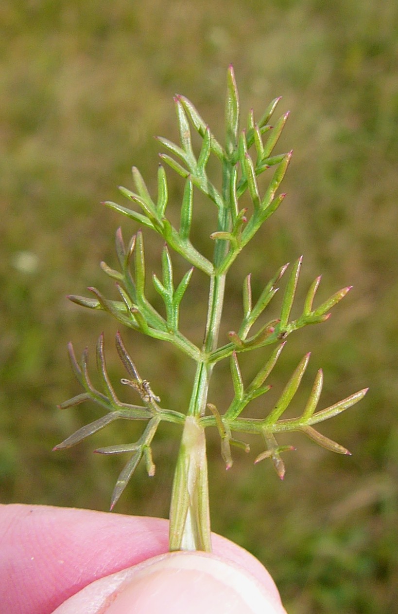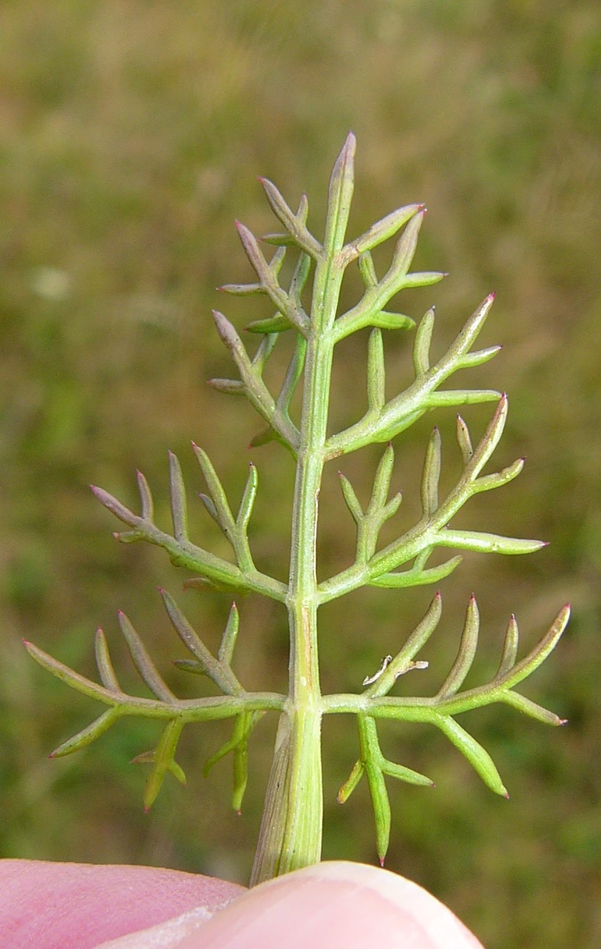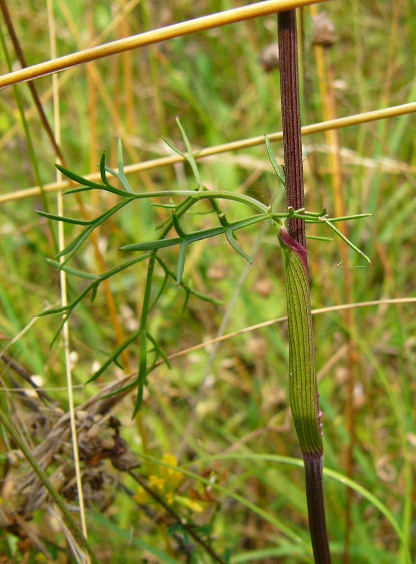 Stängelblätter 2 - 3- fach gefiedert, Blattscheide 12 - 22 mm lang Rhachis rinnig Blätter beiderseits kahl Grundblätter 7 - 9 cm lang, 3 - 4 cm breit, im