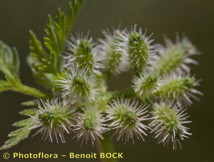 Äußere Früchte mit geraden, an der Spitze widerhakigen, kräftigen Stacheln, teilweise ohne Stacheln, innere Früchte warzig, meist ohne Stacheln