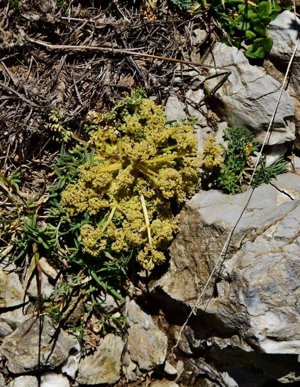 Grundblätter 2 - 3 fach gefiedert, 15 - 80 mm lang, Fiederabschnitte 2 - 12 mm lang, 9,5 - 1 mm breit, blaugrün linealisch, etwa 5 mm lang und 1 mm breit, an der Spitze stumpf