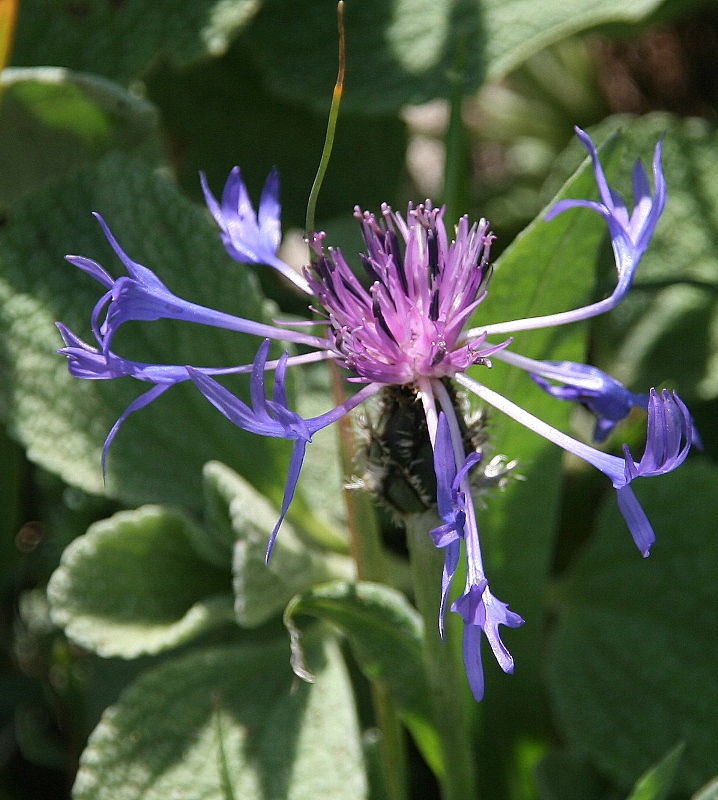 Äußere sterile Blüten blau, strahlend, mit langer, weißlicher Kronröhre und zerzupft wirkenden, schlanken, 1 - 2 mm breiten Kronzipfeln, innere Blüten violett