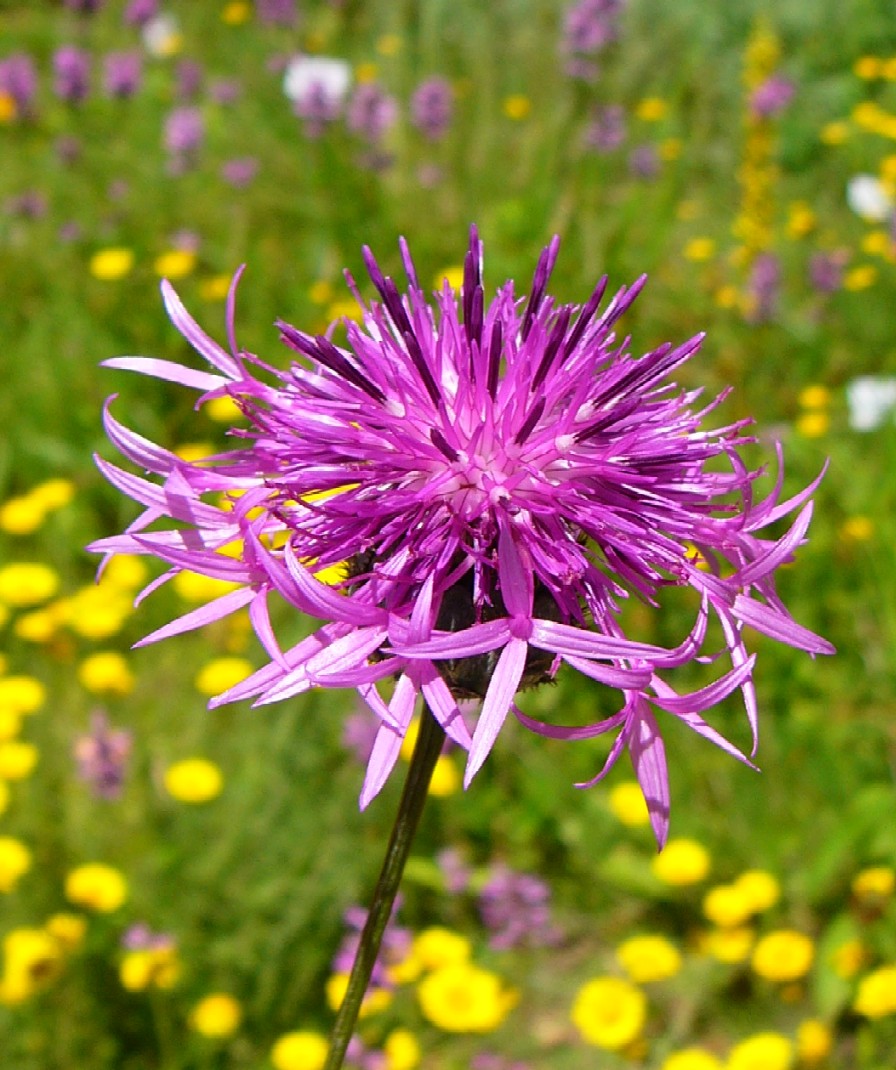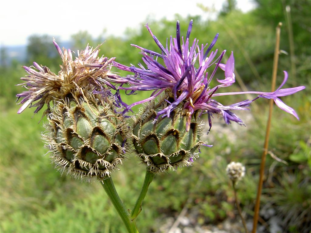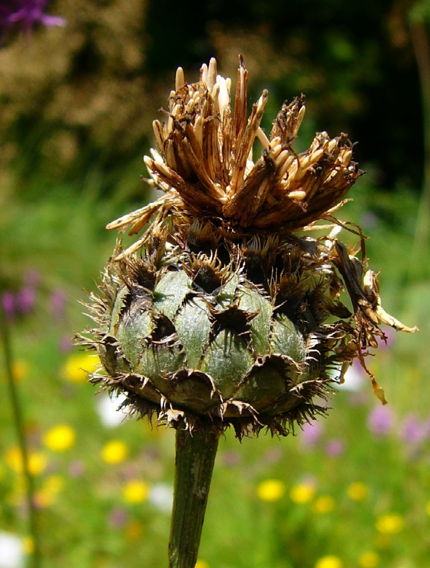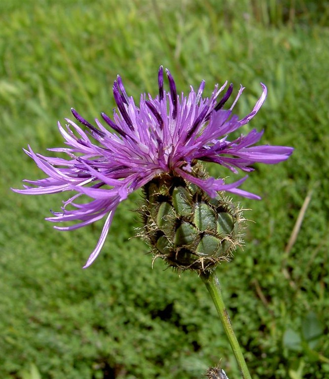 Pflanze 50 - 120 cm groß Stängel meist mit 3 oder mehr Köpfchen Hülle 18 - 25 mm breit, Anhängsel schwarz, die grünen Hüllblätter nicht verdeckend, mit breitem herablaufenden Hautsaum und 8 - 12 Paar Fransen Früchte 4 - 5 mm lang, braun, mit 4 - 5 mm langem Pappus