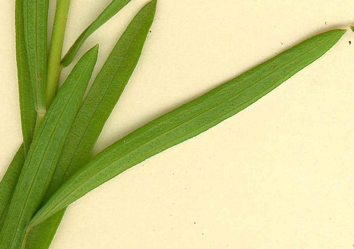 Köpfchen mit 5 - 10 Zungenblüten Hüllblätter kahl, oft etwas glänzend Stängel rau, Blätter schmal lanzettlich, sitzend, drüsig punktiert, obere Blätter nur mit Mittelnerv, selten länger als 3 cm Untere Blätter meist 3- nervig, 2 - 4 mm breit