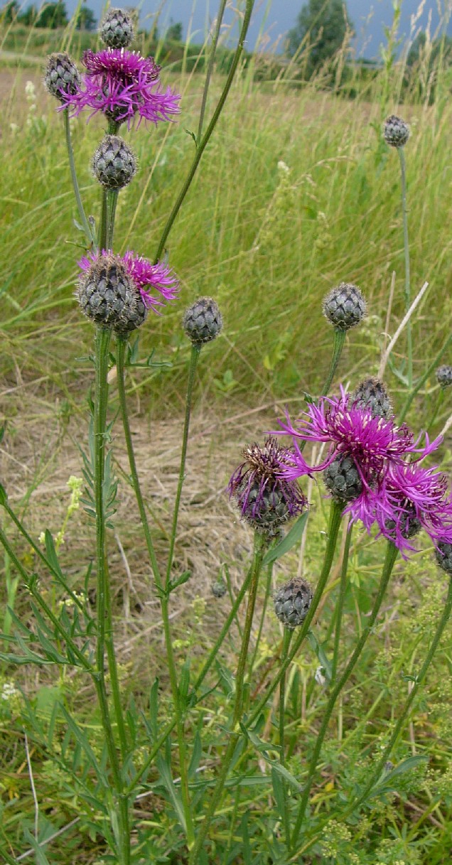 Pflanze 50 - 120 cm groß Stängel meist mit 3 oder mehr Köpfchen Hülle 18 - 25 mm breit, Anhängsel schwarz, die grünen Hüllblätter nicht verdeckend, mit breitem herablaufenden Hautsaum und 8 - 12 Paar Fransen Früchte 4 - 5 mm lang, braun, mit 4 - 5 mm langem Pappus