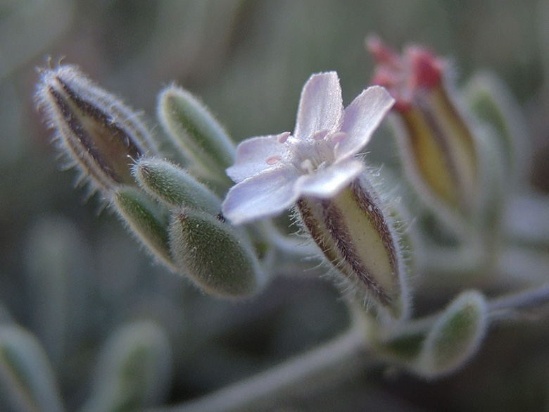 Kelch 5 mm lang, mit langen drüsigen und nichtdrüsigen, abstehenden Haarendrüsig behaart, mit 5 deutlichen grünen oder purpurroten Rippen, Kelchblätter durch häutige Kommissuren verbunden, Blütenstiele 6 - 9 mm lang, drüsig, meist etwas länger als der Kelch