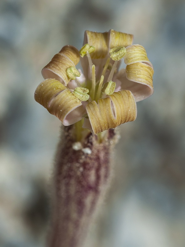 Kelch länglich- walzig, 20 - 32 mm lang, im oberen Teil verbreitert, mit 10 Adern, die im oberen Teil Queradern aufweisen, mit langen Drüsenhaaren