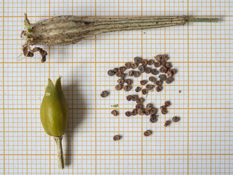 Samen warzig, nierenförmig, an den Seiten konkav, Rücken mit undeutlicher Furche Stängel im oberen Teil drüsig behaart, im unteren