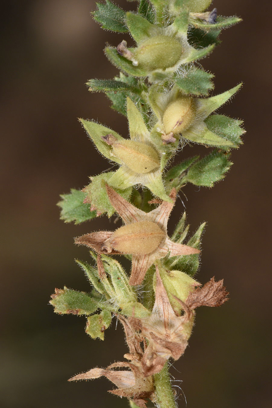 Frucht 3 - 5 mm, eiförmig, in den Kelch eingeschlossen, mit drüsigen und nichtdrüsigen Haaren, mit 1 - 3 Samen, Samen nierenförmig, knotig-rau Stängel schlank, mit langen drüsigen und nichtdrüsigen Haaren,