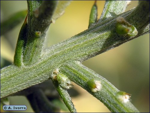 Stängel, Dornen und Phyllodien dicht angedrückt behaart, wodurch die Pflanze silbern erscheint