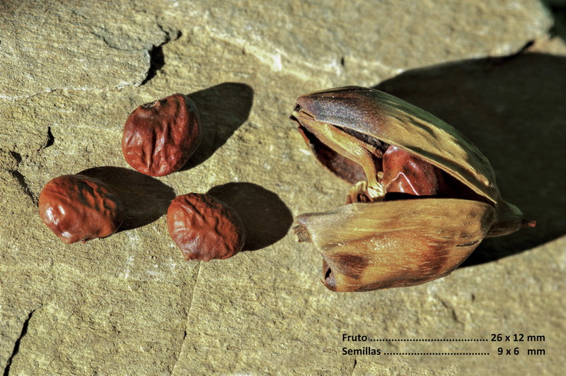 Früchte 25 - 30 mm lang, glänzend, ellipsoid, zweifächerig, mit 2 - 4 Samen