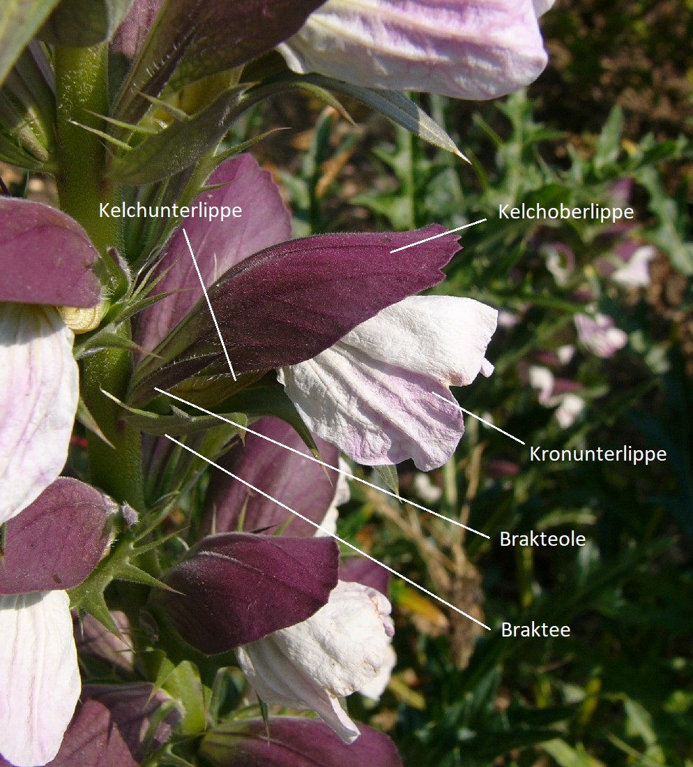 Mit 4 ungleichen Kelchblattlappen: das oberste ist rötlich- violett, helmförmig, die seitlich klein und lanzettlich, das untere meist vom dornigen Tragblatt verdeckt