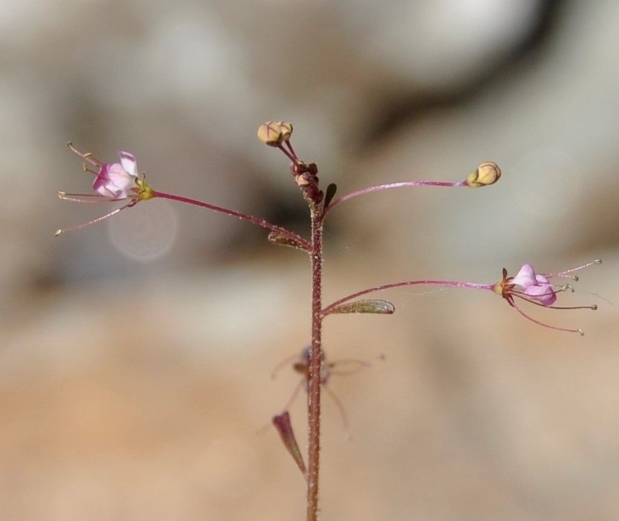 hellviolett, selten weißlich Kelchblätter eiförmig, stumpf oder zugespitzt Blütenstiele, Kelchblätter und Schoten kahl oder mit wenigen Drüsen > 3