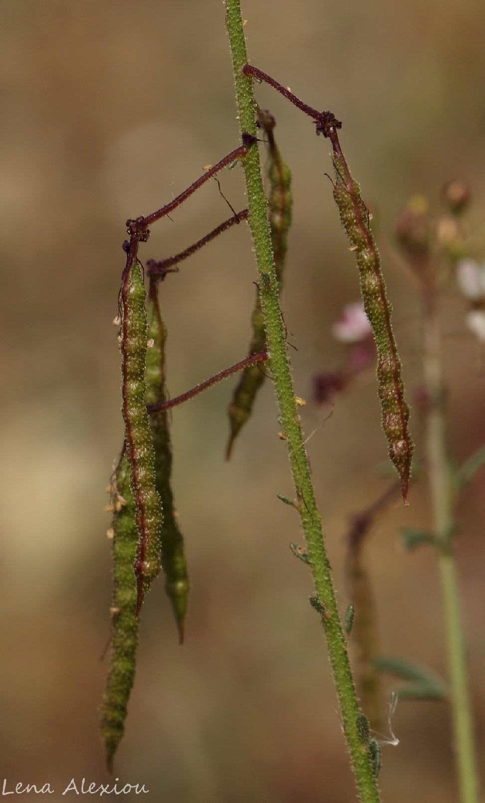 4 Blüten weißlich oder gelblich, oft mit rotem Streifen, Kelchblätter lanzettlich, spitz, Blütenstiele, Kelchblätter und oft auch die Schoten dicht drüsig