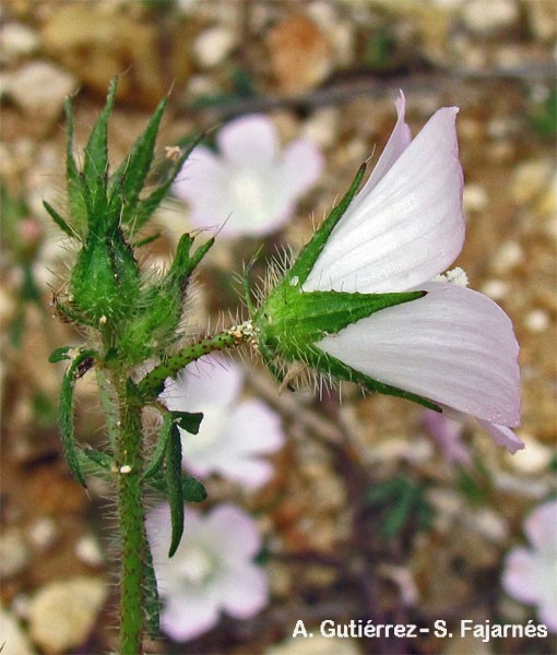 1 Blütenstiel nur mit einfachen Haaren, Kronblätter hellrosa, bis doppelt so lang wie die Kelchblätter, nur in Spanien
