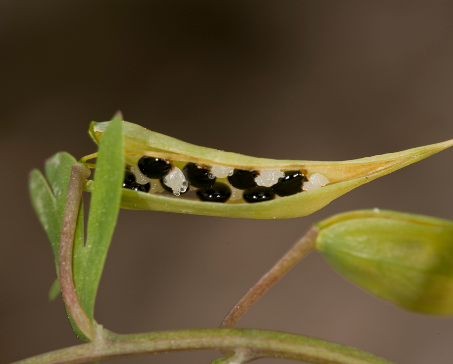 Schoten mit bis zu 7 schwarzen Samen, Samen mit Anhängseln (= Elaiosomen)