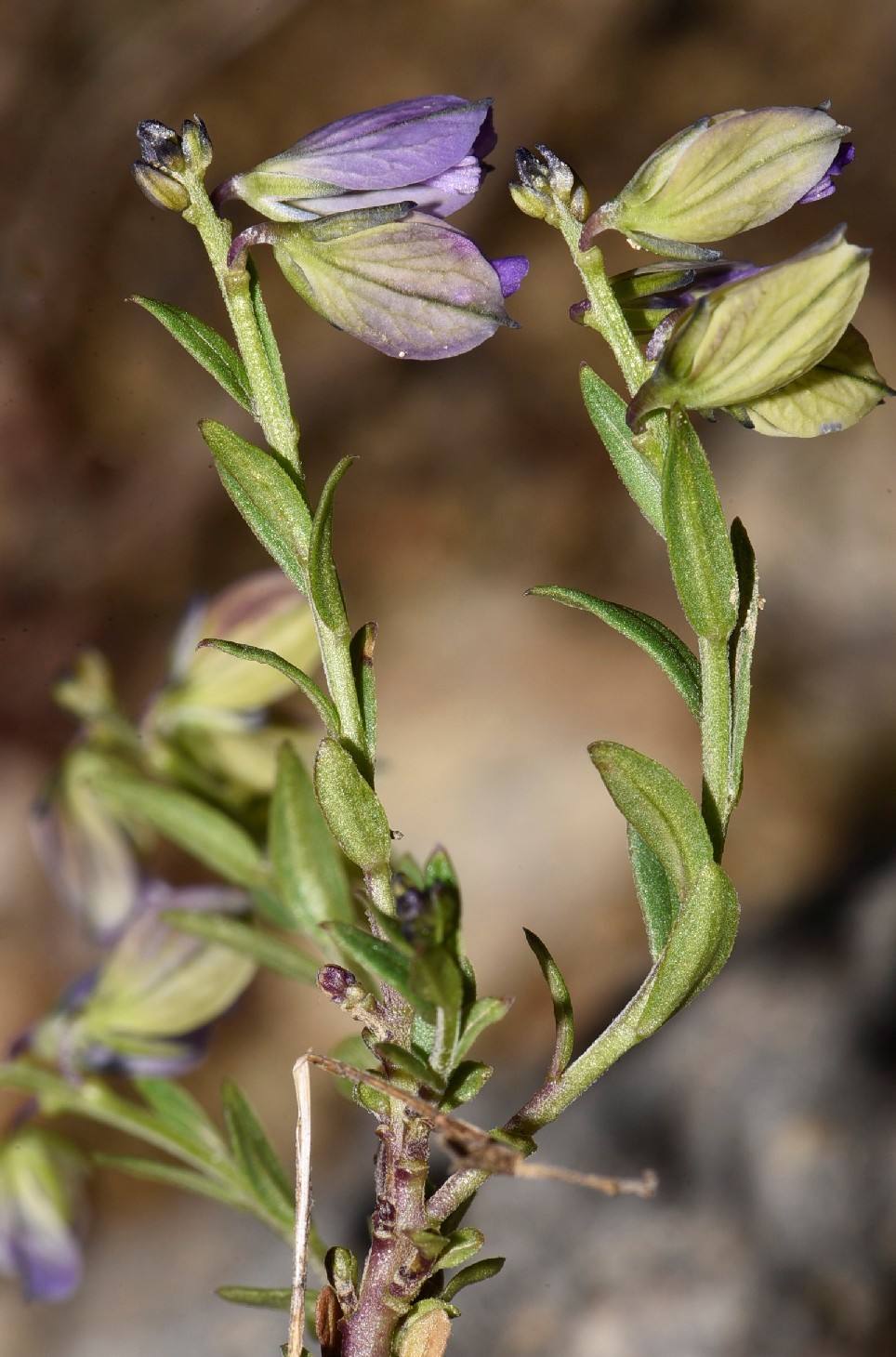 schmal elliptisch, 5 mm lang, 2-3 mm breit, rosaviolett, Kapsel 5 mm lang, 3 mm breit, sitzend, breiter als die Flügel Blätter sitzend, die unteren oval oder oval-elliptisch, keilförmig, 5-10 (13) x 3-4 mm, einnervig, mit dünnem, rauhem Rand, manchmal bewimpert, manchmal länglich, 12 x 5 mm; die oberen Stängelblätter lanzettlich, 10-15 (20) x 2-4 mm, rundlich, stumpf