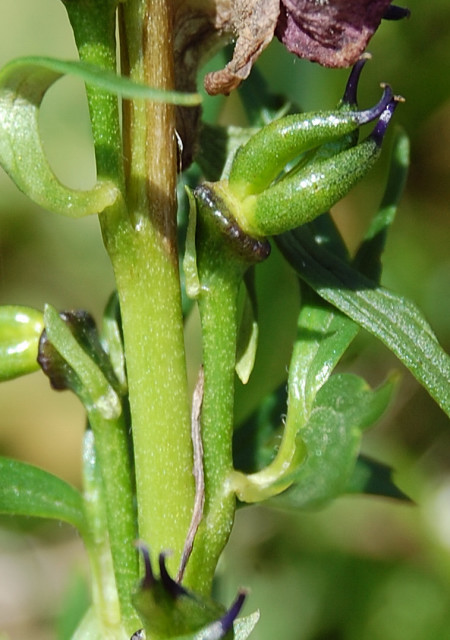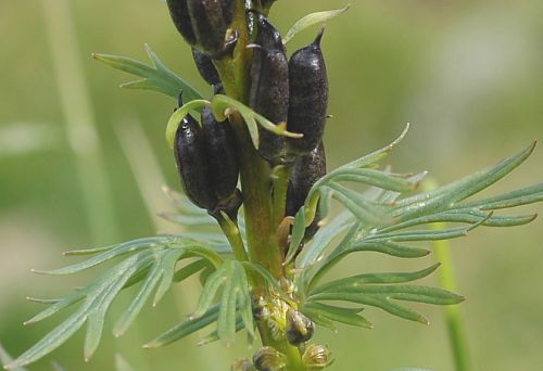 Eisenhut- Blüten blau, Blätter nicht bis zum Grund geteilt, Blüten meist dunkelblauviolett, außen kahl, Helm breiter als hoch,