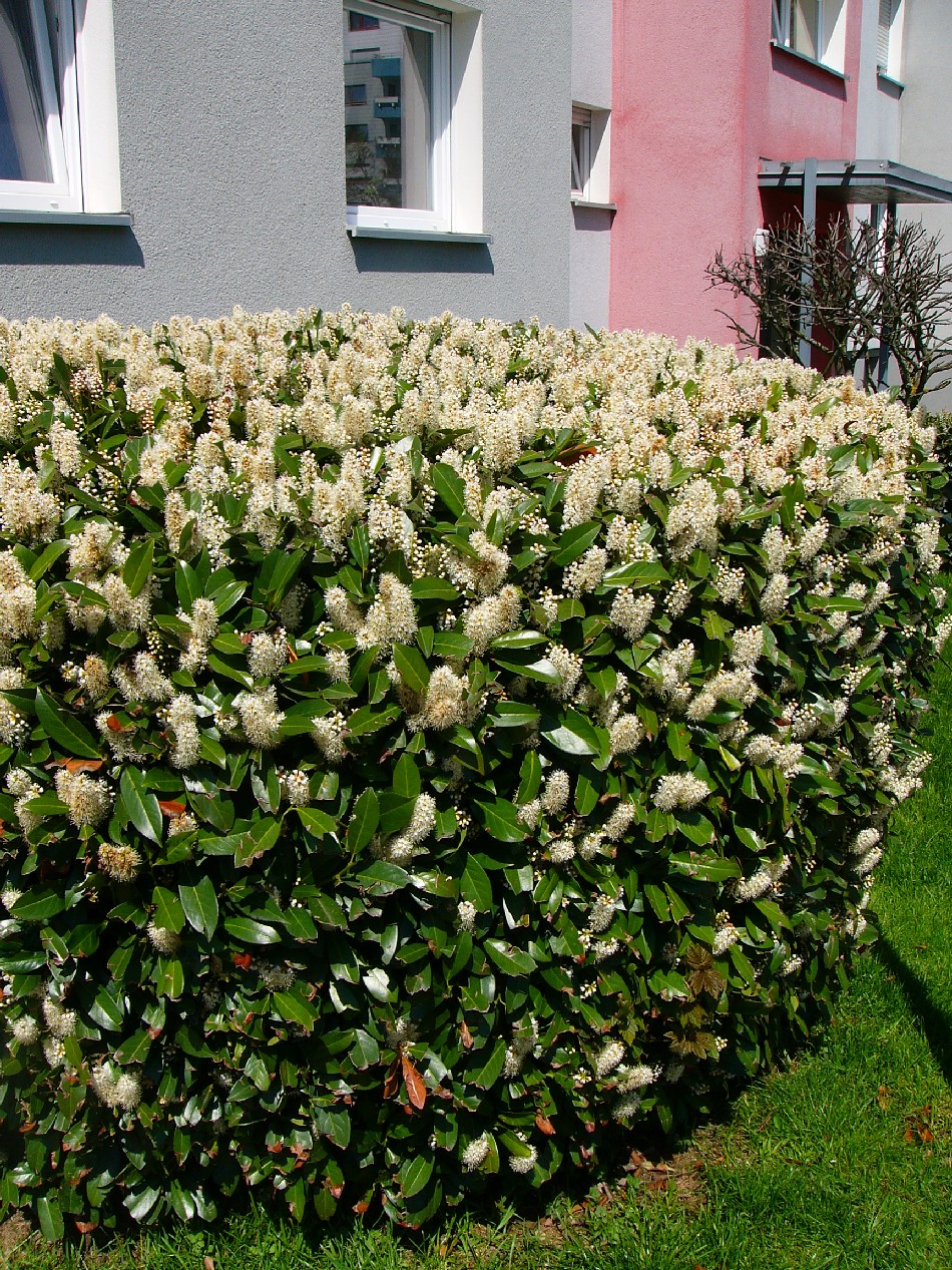 IV - V, Hecken, Ziergehölze, Rabatten Prunus laurocerasus kann im Herbst zu einer zweiten Blüte kommen! Synonyme: English