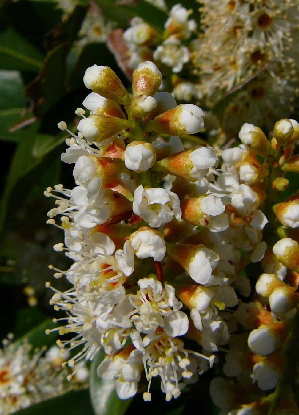 Prunus - Blüten in vielblütigen Trauben, Blätter immergrün, ledrig