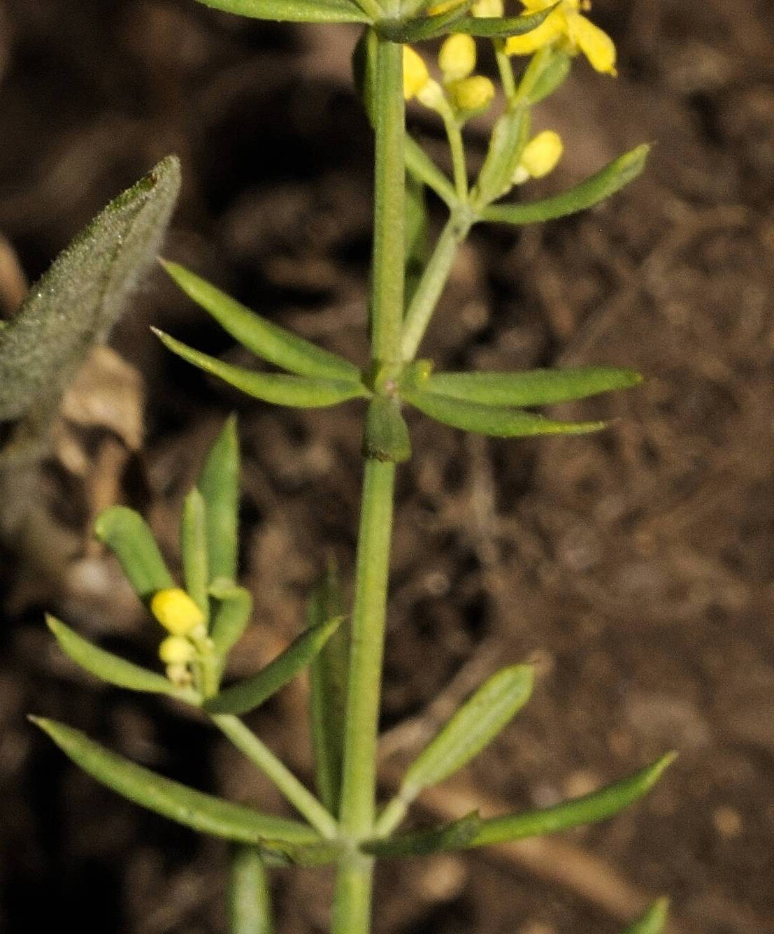 1 Stängel im mittleren Teil kahl, Blätter blaugrün, bereift, im Wirtel zu 6 - 8, +/- flach, kahl