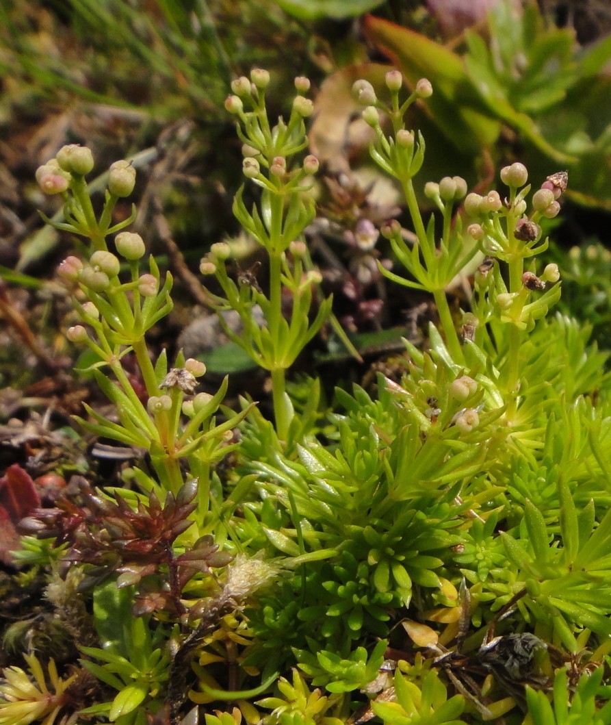 Blätter meist zu 8 im Wirtel, eilanzettlich, 5 - 9 mm lang, 1,1 - 1,5 mm breit, dicklich, mit kaum erkennbarem Mittelnerv, ölig glänzend, ohne oder mit undeutlicher Grannenspitze, am Rand völlig glatt