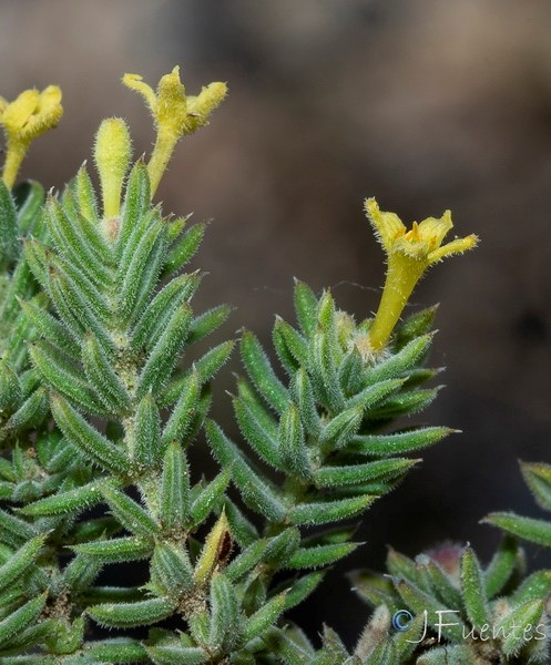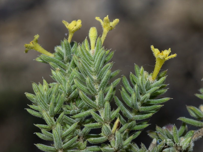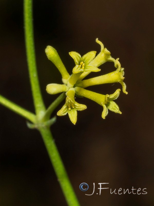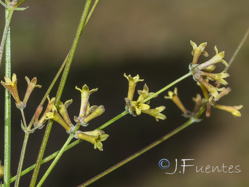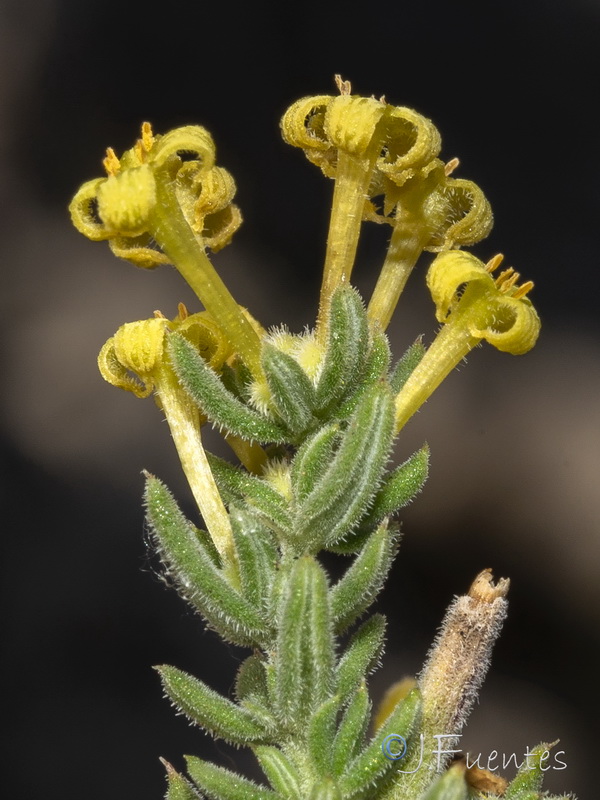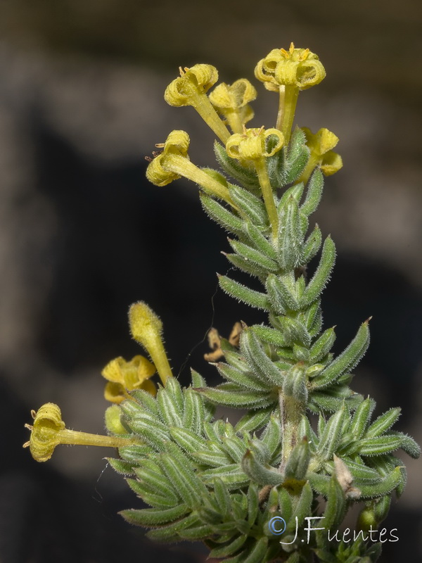 Blüten +/- sitzend, gelb, in den Achseln der Blätter, mit schmaler, langer Kronröhre und 4