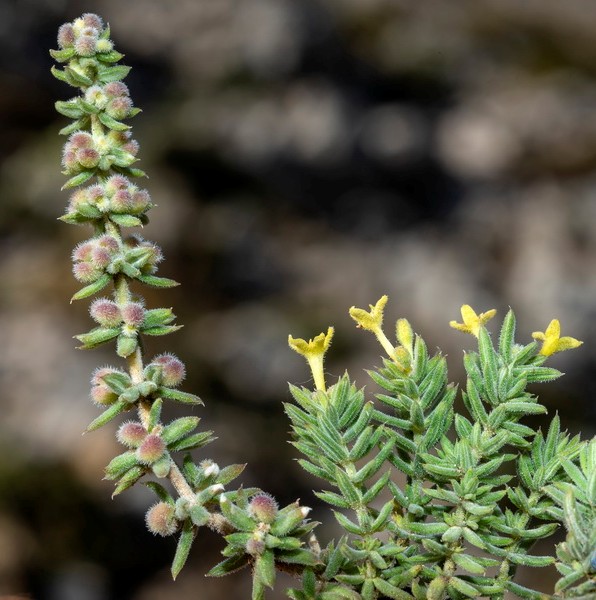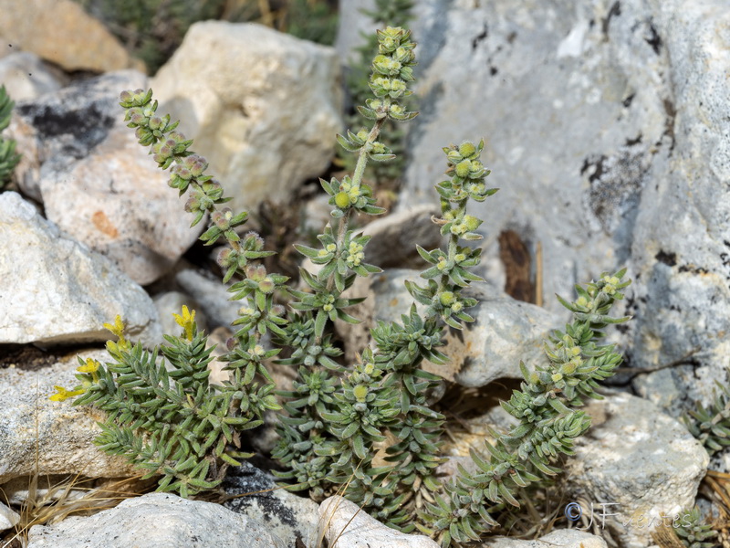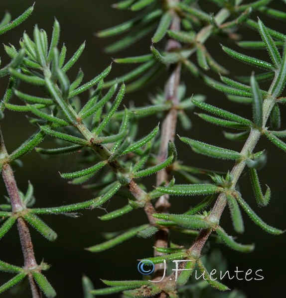 Blätter linealisch, 7 - 13 mm lang, 0,7 - 1 mm breit, mit Stachelspitzchen, am Rand umgerollt, oberseits gleichmäßig warzig- rau, unterseits dicht weißfilzig behaart