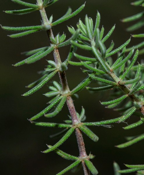 Blätter linealisch, 15 - 35 mm lang, 1 mm breit, mit Stachelspitzchen, am Rand umgerollt, oberseits glänzend grün, glatt oder durch winzige (0,1 mm) Warzen rau, unterseits dicht weißlich behaart