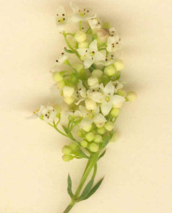 Blüten weiß, 4 mm im Durchmesser, radförmig, Kronzipfel mit kurzer Granne