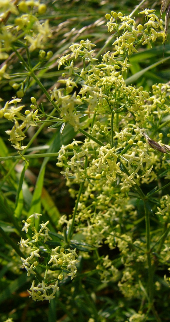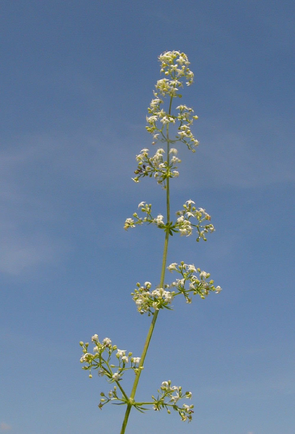 Labkraut - Stängel ohne Stacheln, Blüten weiß, radförmig ausgebreitet, Kronblätter mit Grannen, Blattquirle mit 6 - 10 Blättern, Blätter 10 - 30 mm lang, 2 - 4 mm breit