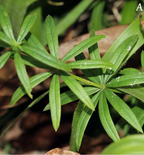 Blätter eilanzettlich, oberseits grün, zu 5 - 11 im Quirl, mit 1 Ader, Stängel ohne Stacheln, Früchte kahl