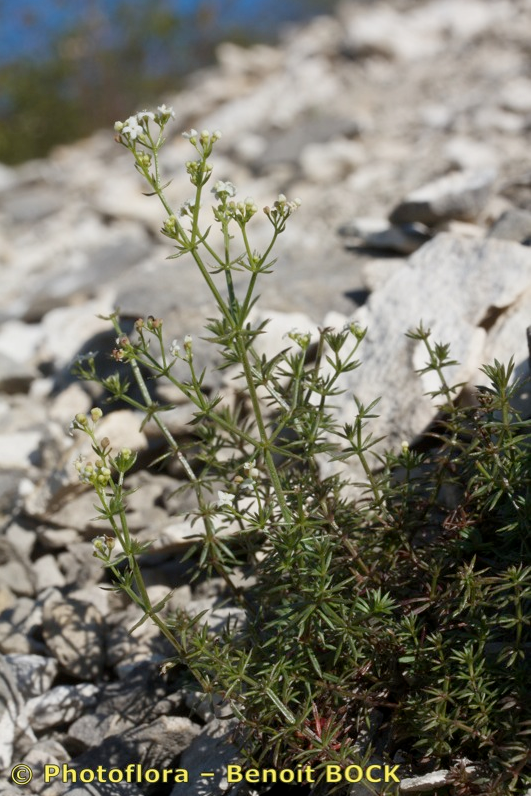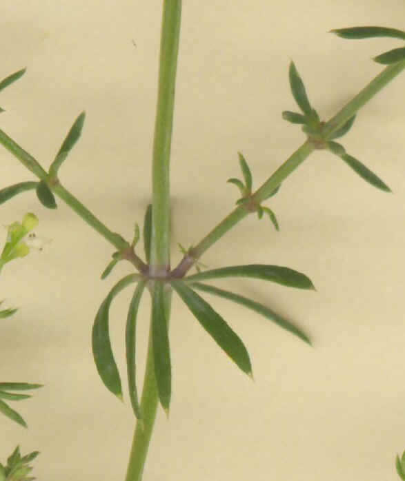 Stängel aufrecht, mittlere Internodien 2 - 5 mal so lang wie die Blätter, Blätter schmal linealisch, 10 - 16 mm lang, 1 - 1,6 mm breit, mit Grannenspitze und deutlichem Mittelnerv, zu 7 - 8 im Wirtel, oft sichelförmig gekrümmt