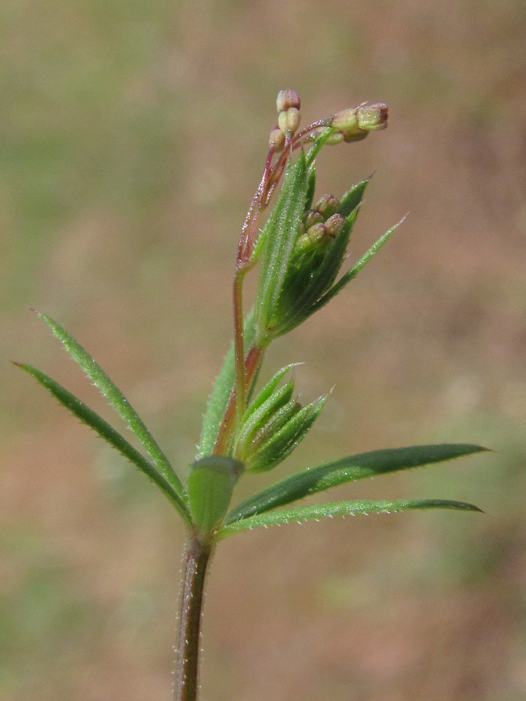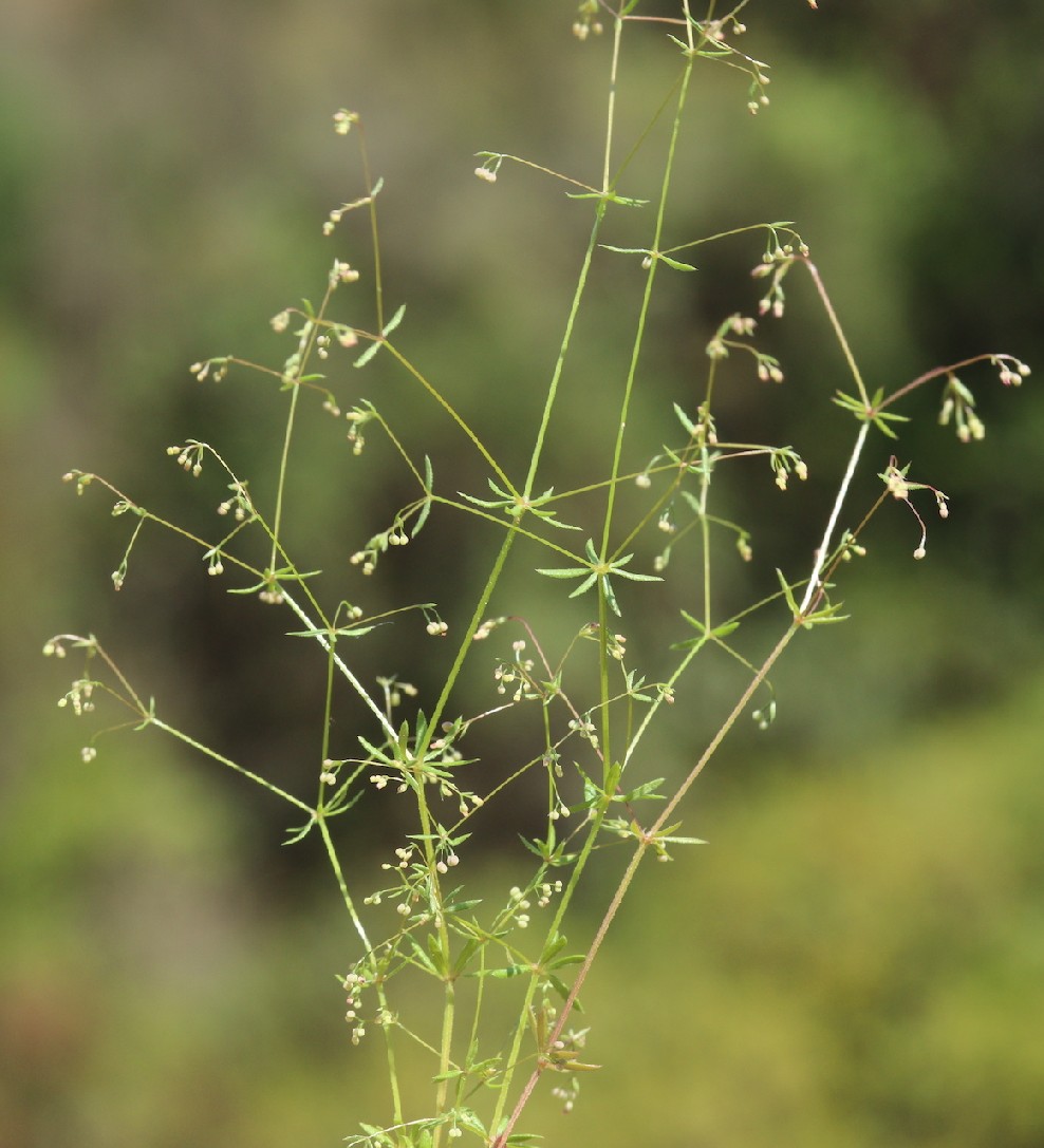Stängel vierkantig, +/- kräftig, mit kleinenStacheln besetzt, Blätter zu 8 - 10 im Quirl, schmal lanzettlich, 10 - 15 mm lang, 1 - 2 mm breit, mit Stachelspitze, am Rand durch vorwärts gerichtete Stacheln rau, am Rand nicht oder nur schwach umgerollt