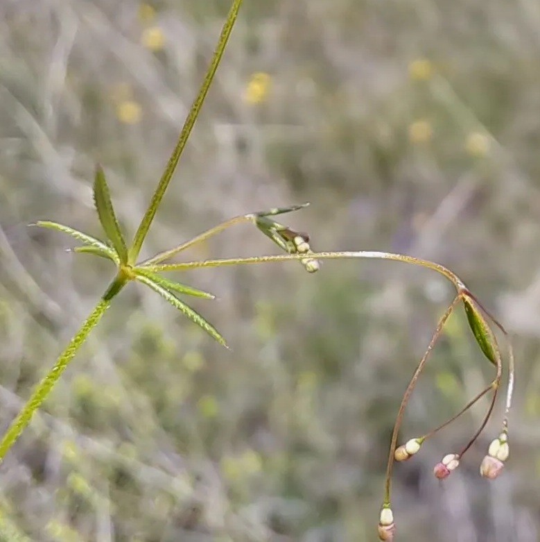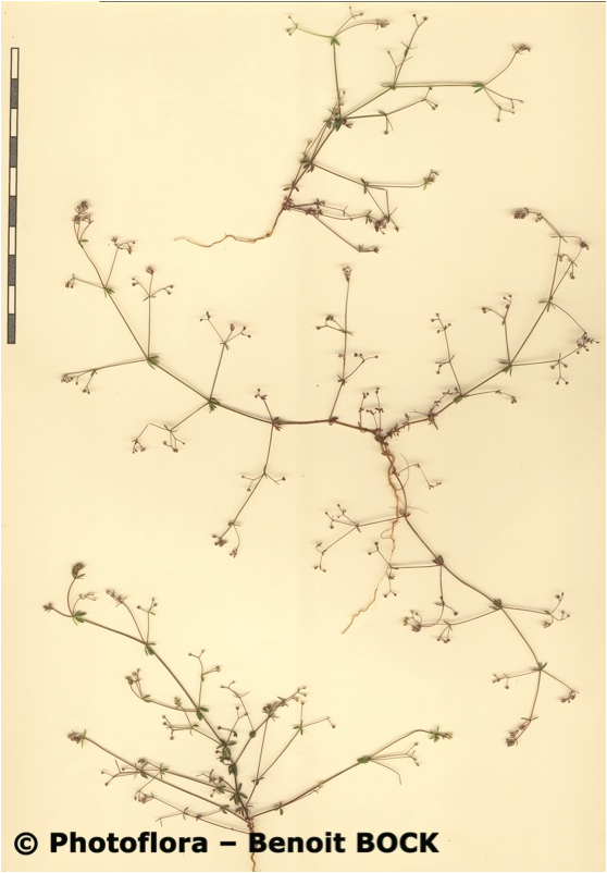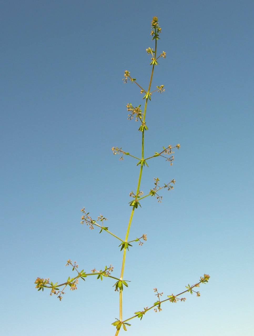Stängel vierkantig, schlank,im oberen Teil fast glatt, im unteren Teil weniger dicht mit Stacheln besetzt als Galium parisiene