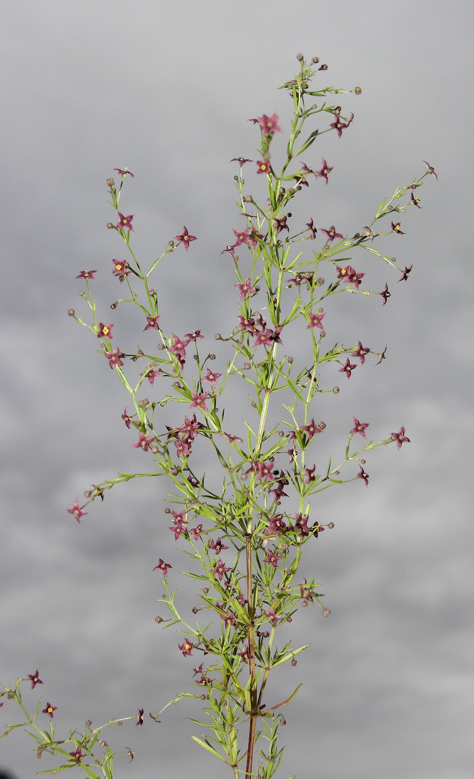 Blüten radförmig, purpurn, 1 - 1,5 mm im Durchmesser, mit 4 Kronzipfeln, Kronzipfel bespitzt, Antheren gelb