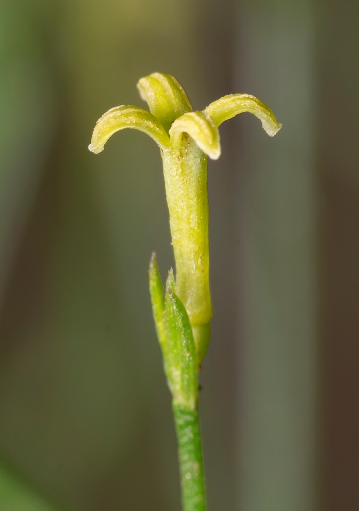 Blüten sitzend, einzeln oder zu 2- 5 in den Achseln von pfriemlichen, spitzen, am Grund verbundenen Tragblättern, Tragblätter der Blüten meist kürzer als die Tragblätter des Teilblütenstandes Blüten grünlich-gelb, 4 Staubblättern, Antheren dunkelviolett