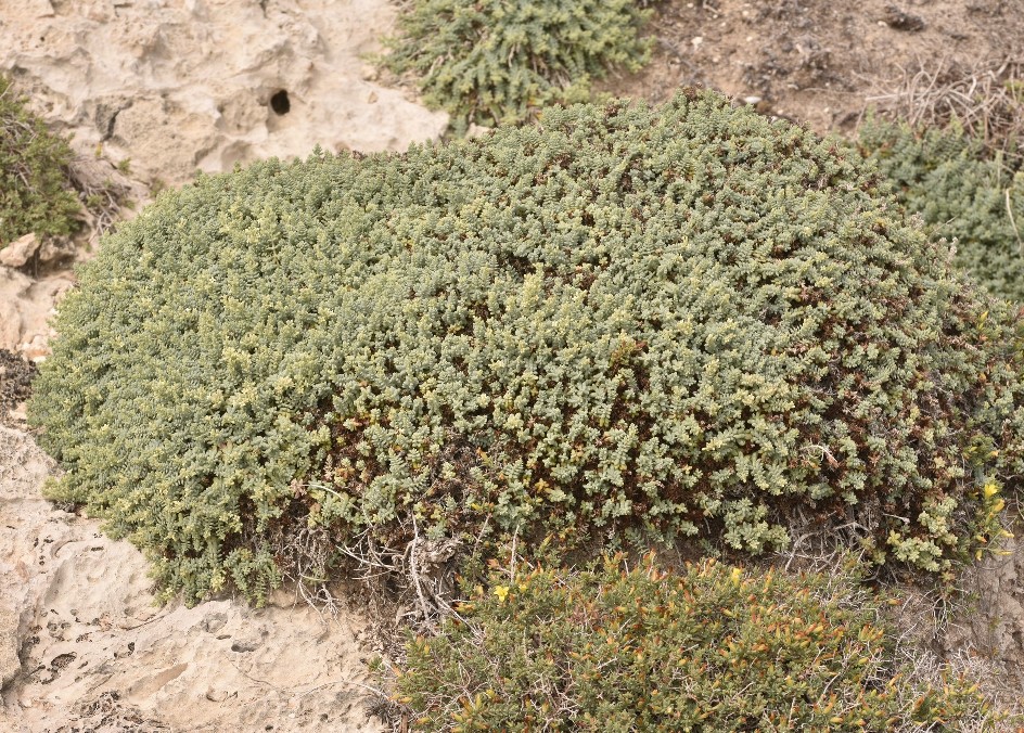 2 Pflanze niederliegend, Blätter 5 - 6 mm lang, +/ umgerollt, dadurch fleischig wirkend