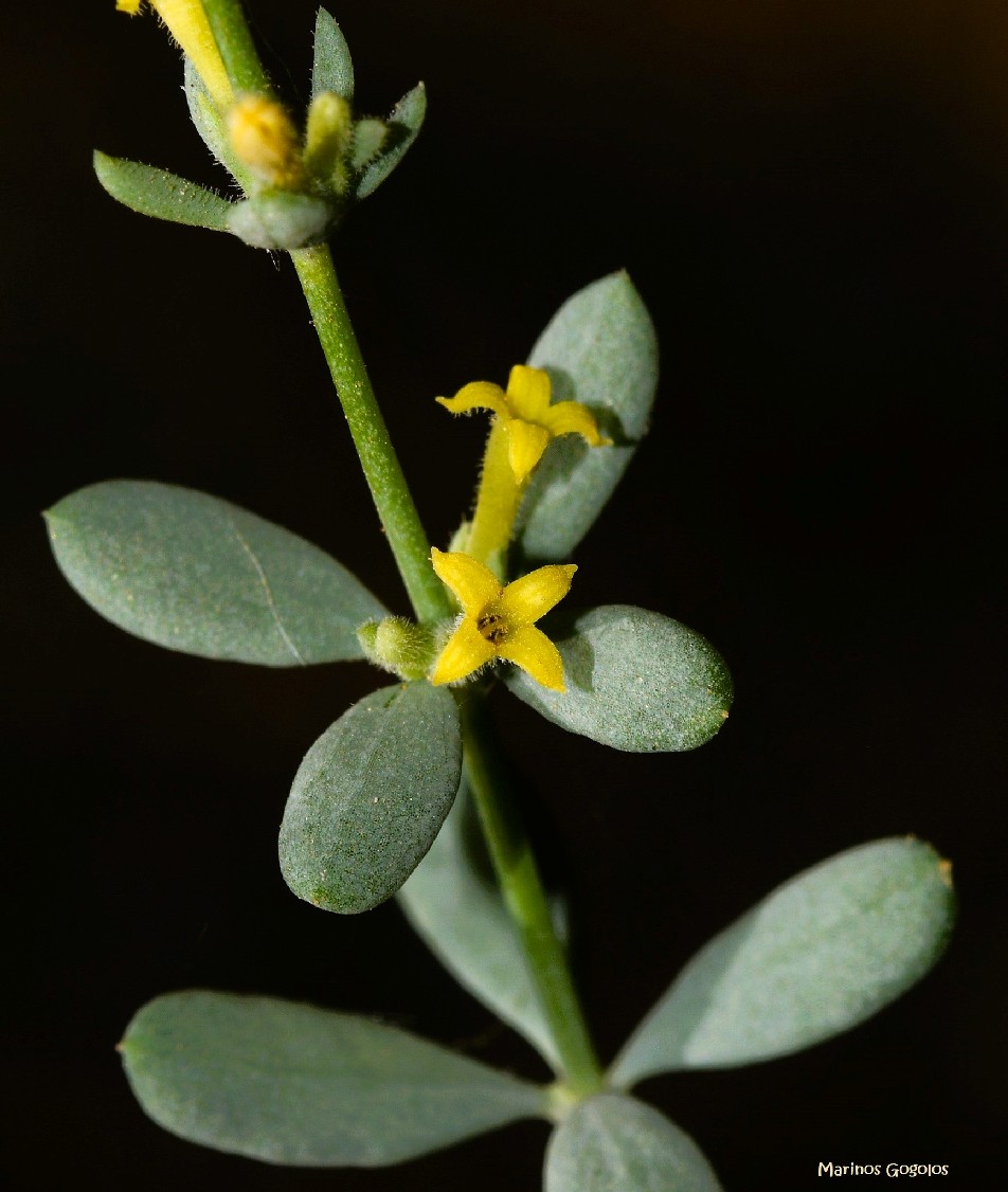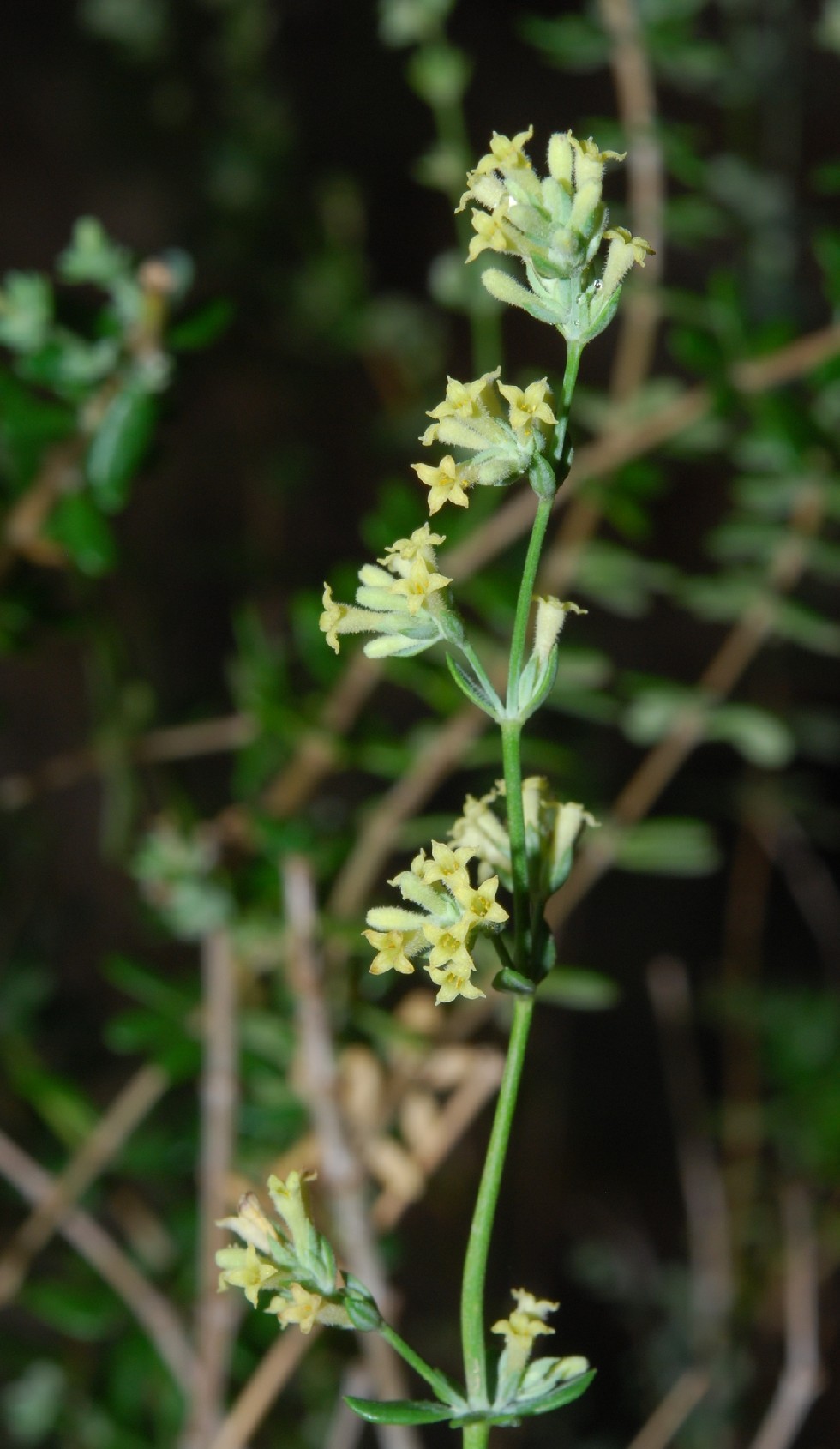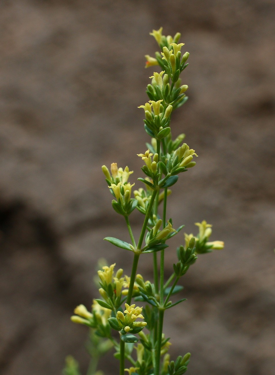 Blütenstand lang pyramidal, mit vielen gegenständigen Seitenästen, die mehrblütige büschelige Teilblütenstände tragen, Tragblätter der Teilblütenstände lanzettlich, kürzer als die Blüten Blüten gelb, glockig, außen behaart Früchte 1,5 - 2 mm lang, behaart Blätter blaugrün, kahl, die unteren im Wirtel zu 6, eilanzettlich oder elliptisch, 12 - 15 mm lang, 6 - 10 mm breit, dick, ledrig, flach oder schwach umgerollt