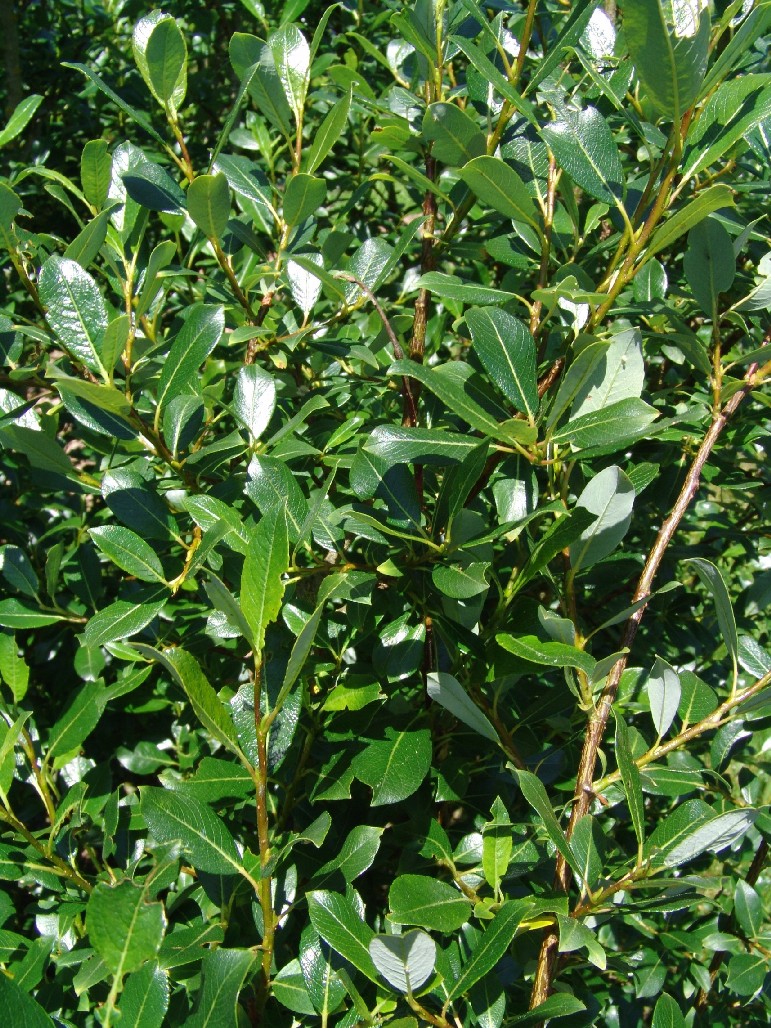 Blätter ca. 4 cm lang, eilanzettlich, oberseits stark glänzend, dunkelgrün, kahl, ganzrandig oder mit seichten Buchten