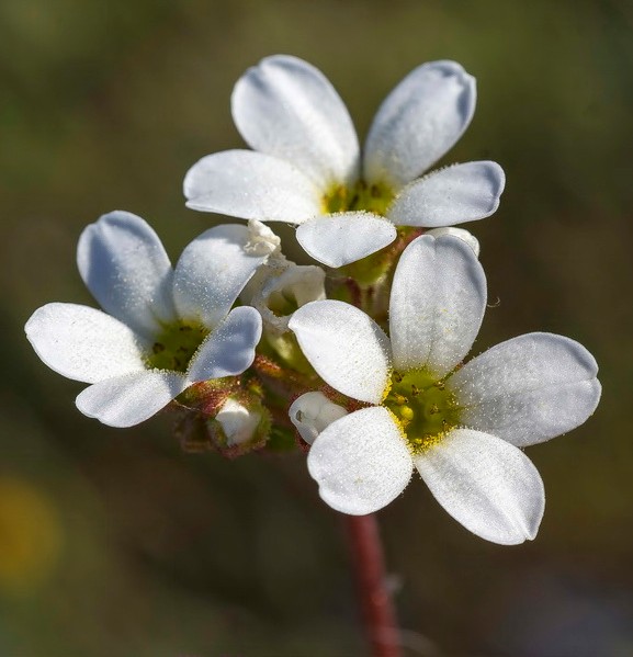 Saxifraga - Pflanze ohne Brutknospen in den Achseln der Stängelblätter, Blüten weiß, ohne Punkte, Kronblätter abgerundet, Blätter weich, rundlich, nicht kalkausscheidend
