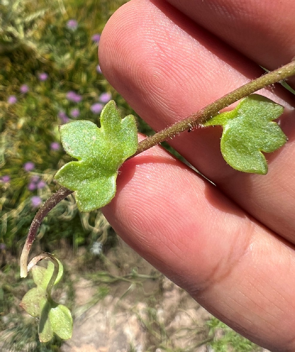 Blattspreite nierenförmig 7 - 18 mm lang, 10 - 27 mm breit, handförmig 3 - 9- lappig, mit stumpfen oder spitzen Blattlappen,