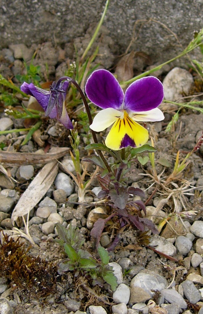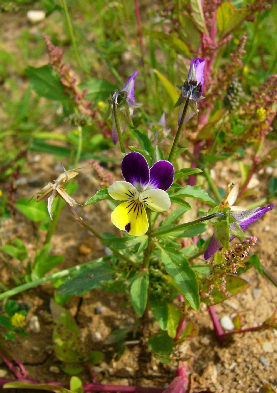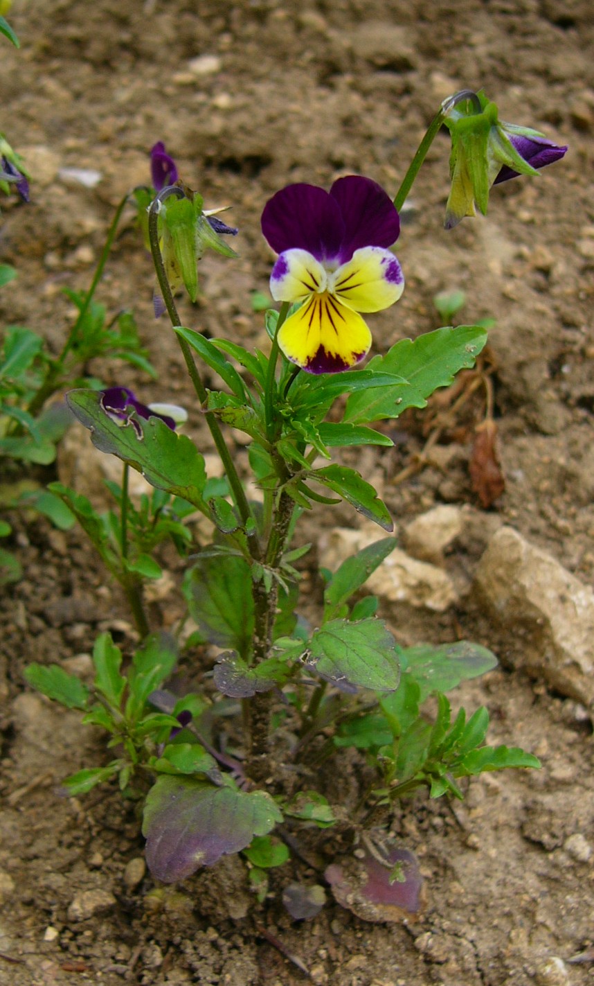 Stiefmütterchen - Stängel 15 - 40 cm hoch, beblättert, Kronblätter violett, hellblau, gelb oder dreifarbig, 1,5 - 4 cm groß, alle Kronblätter länger als die Kelchblätter, Endabschnitt der Nebenblätter deutlich länger und breiter als die Seitenabschnitte
