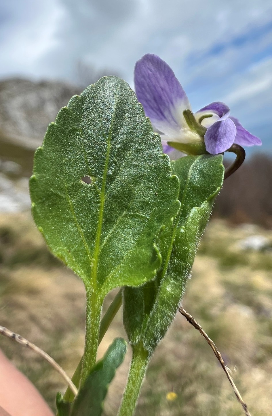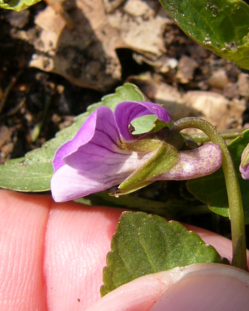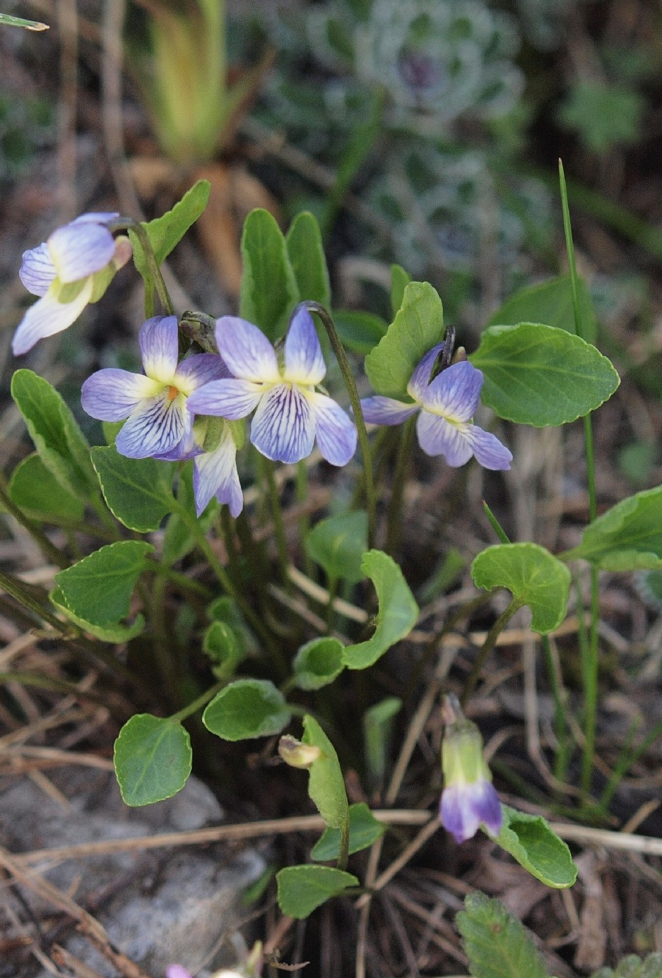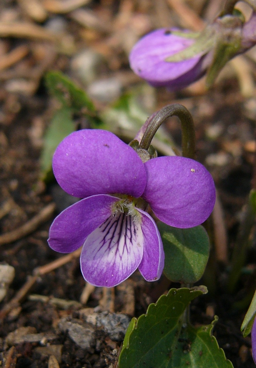 Viola - Blüten blau/violett, seitliche Kronblätter abwärts gerichtet, bebärtet, Sporn hell- oder dunkelviolett, Kelchblätter stumpf, Blätter +/- behaart, so lang oder länger als breit, Fransen der Nebenblätter nicht bewimpert
