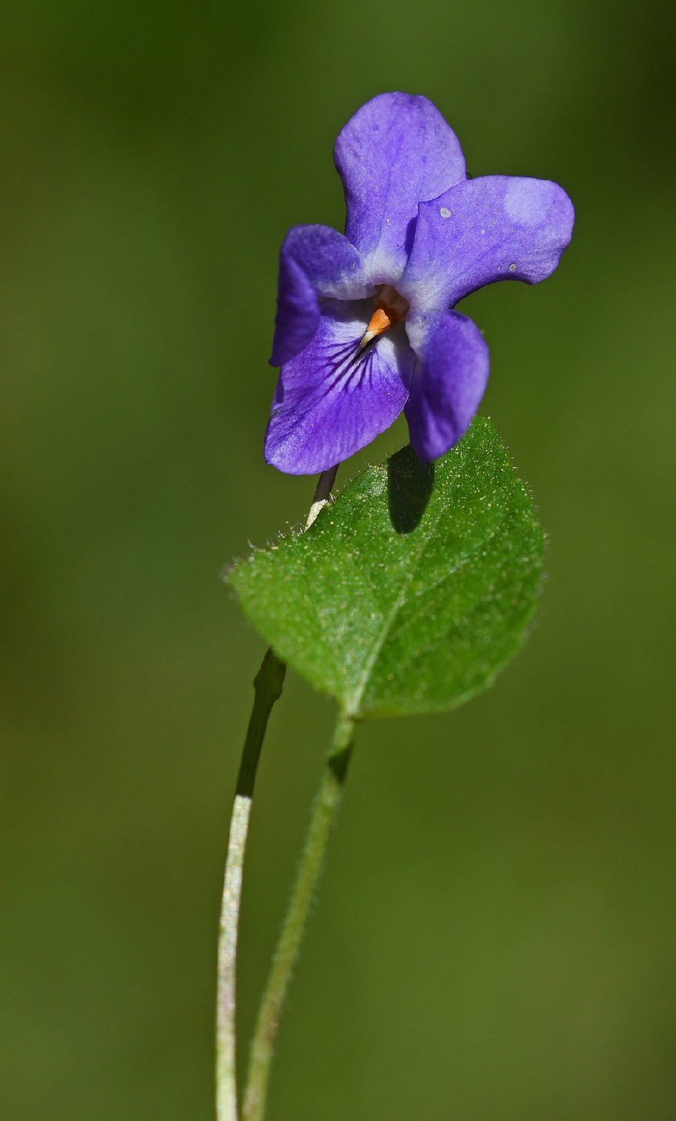 Viola - Blüten hellviolett, nicht gefleckt, seitliche Kronblätter abwärts gerichtet, bartlos, Kelchblätter stumpf, Blätter länger als breit, Blüten-, Blattstiele oder Blätter behaart,
