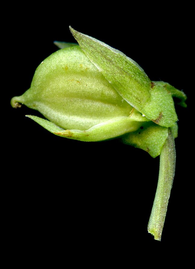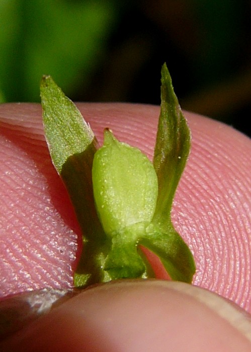 Sporn grünlich- weiß, dicklich, Kelchblätter spitz, mit deutlichen Kelchblattanhängseln