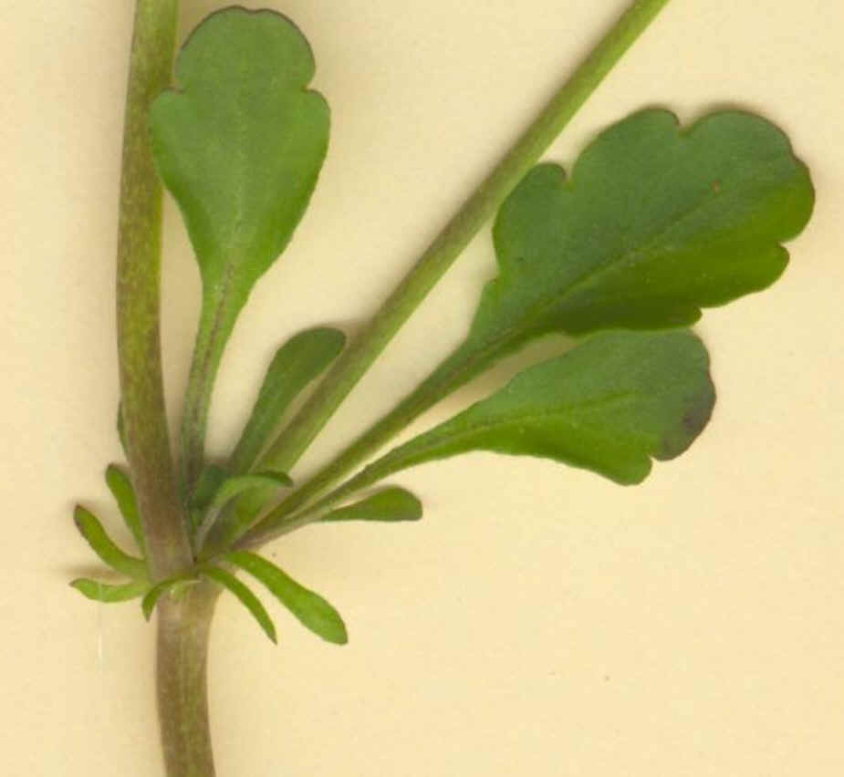 Untere Blätter lang gestielt, Blattspreite rundlich, beiderseits mit 2 - 3 Kerben, kahl oder am Rand kurz gewimpert