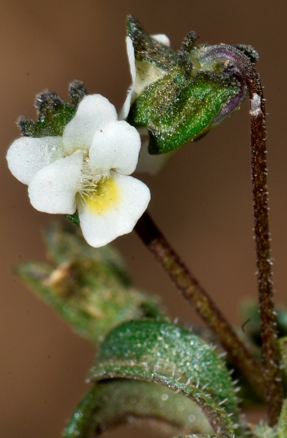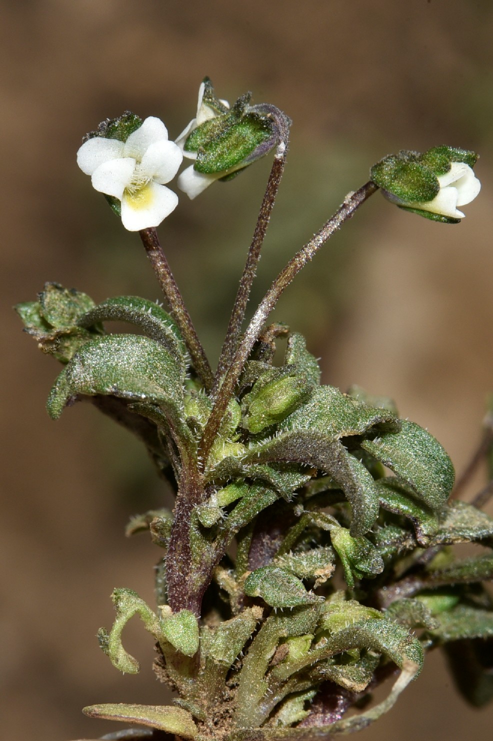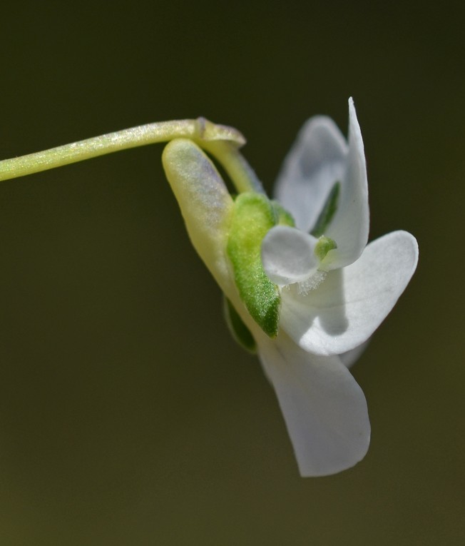 Blüten weiß oder cremefarben, im Schlund gelb, nur 4 - 7 mm hoch, mit oder ohne Strichzeichnung, unteres Kronblatt einschließlich Sporn 4 - 6 mm lang, Kronblätter kaum länger als die Kelchblätter, Sporn 1,5 mm lang, stumpf, kürzer als die ca. 1 mm langen Kelchanhängsel, Kelchblätter 3 - 6 mm lang, behaart